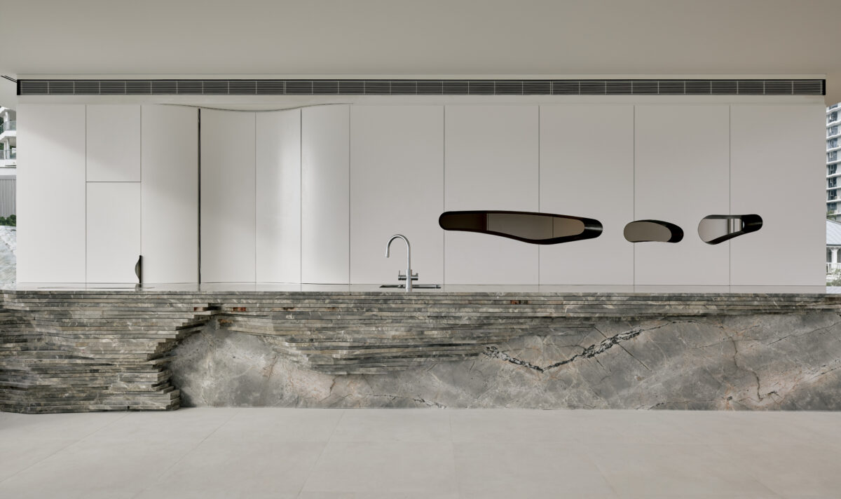 The landscape references continue into the interiors of the two bespoke residences, with the kitchens and bathrooms featuring vanities in organic striated forms hewn from natural stone, reflecting the dark tones of the local Burleigh basalt.