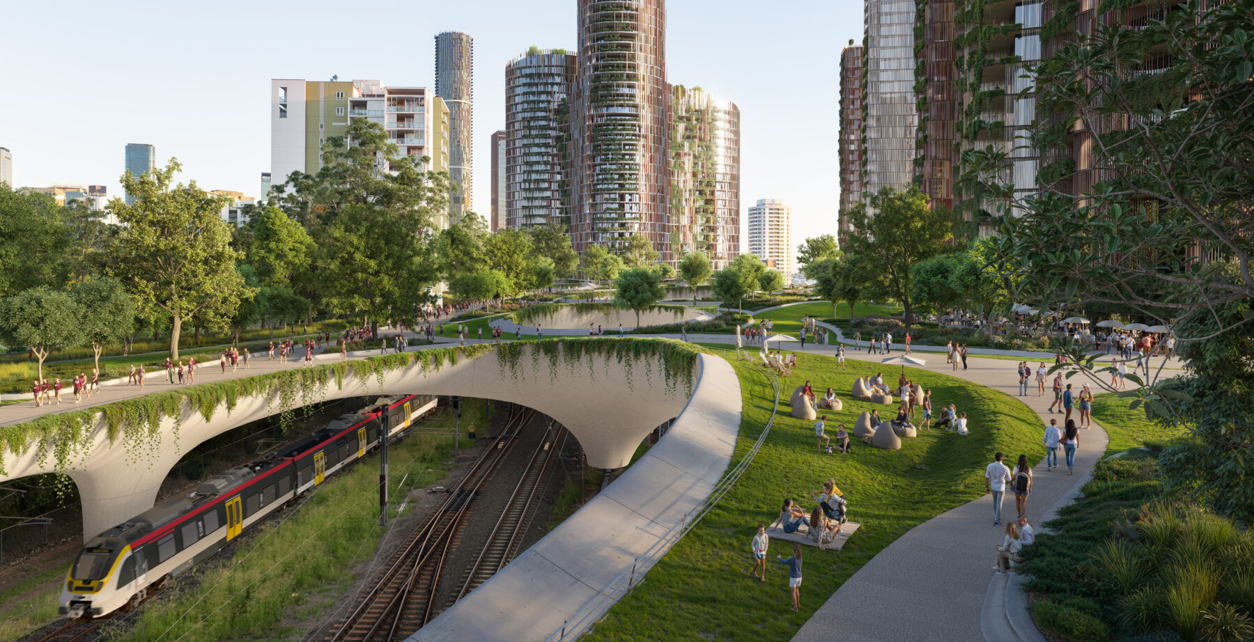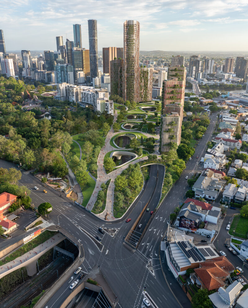 “By building an elevated walkable green canopy over the Roma Street Railway Yards, we can give 7.5 hectares of new green space back to the city,” said Liam Proberts, Managing and Creative Director of bureau^proberts.