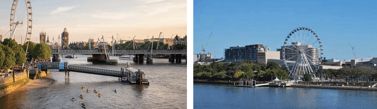 Both cities are dominated by central rivers, which are bordered by significant cultural, commercial, and social assets, including cultural precincts, heritage sites, business districts, and leisure attractions such as arts centres, Ferris wheels, and parklands.