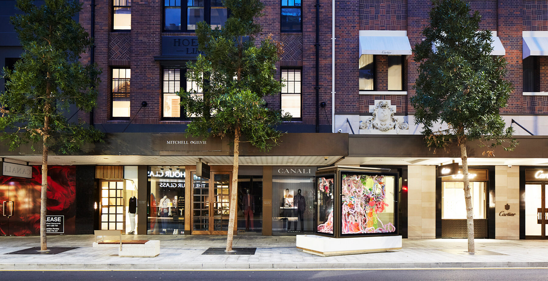 The Vitrines were designed to be robust enough to handle the traffic of the street, yet elegant enough to reflect the context of the fashion precinct of Edward Street. Materials such as coloured concrete were employed to bring a robustness in both expression and structure. Patterns imprinted in the concreted, created using pressed-metal, reference the historic pressed-metal ceilings of the area. The requirements for displaying artwork within each vitrine called for detailed consideration to design and deliver: