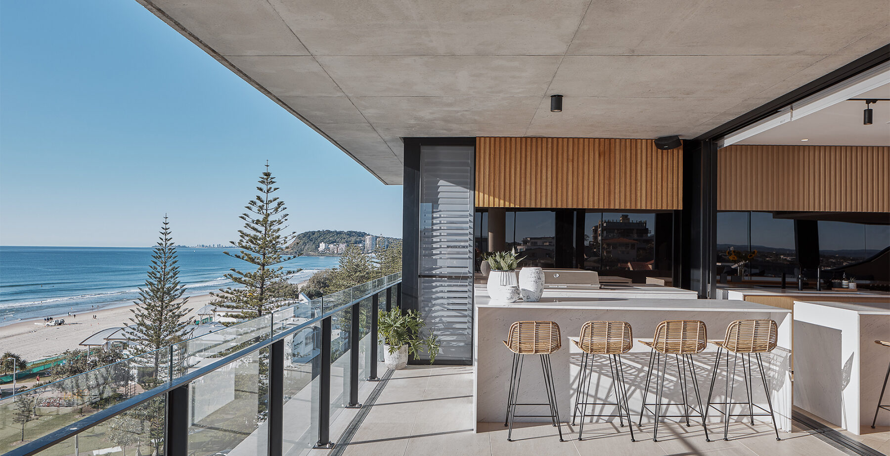 NORTH comprises seven, whole-floor apartments, each designed to engender a sense of belonging to the Burleigh Heads community. The character of the built form is inspired by the rock formations of the nearby headland to imbue, in the skirting spandrel panels, a sense of geometric abstraction and strong visual identity. The protection and privacy afforded by these concrete elements is further supported by light-weight elements expressed in the screened edges that wrap the building. Extensive glazing and open terraces to the east engender a sense of openness and connection to the street, beach and ocean.