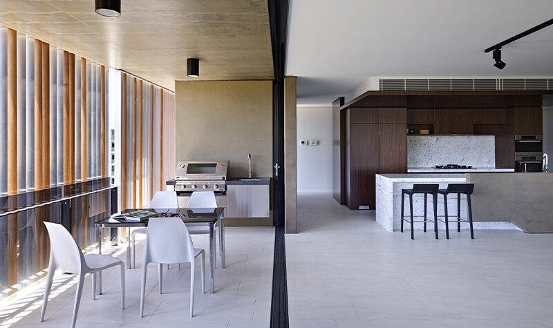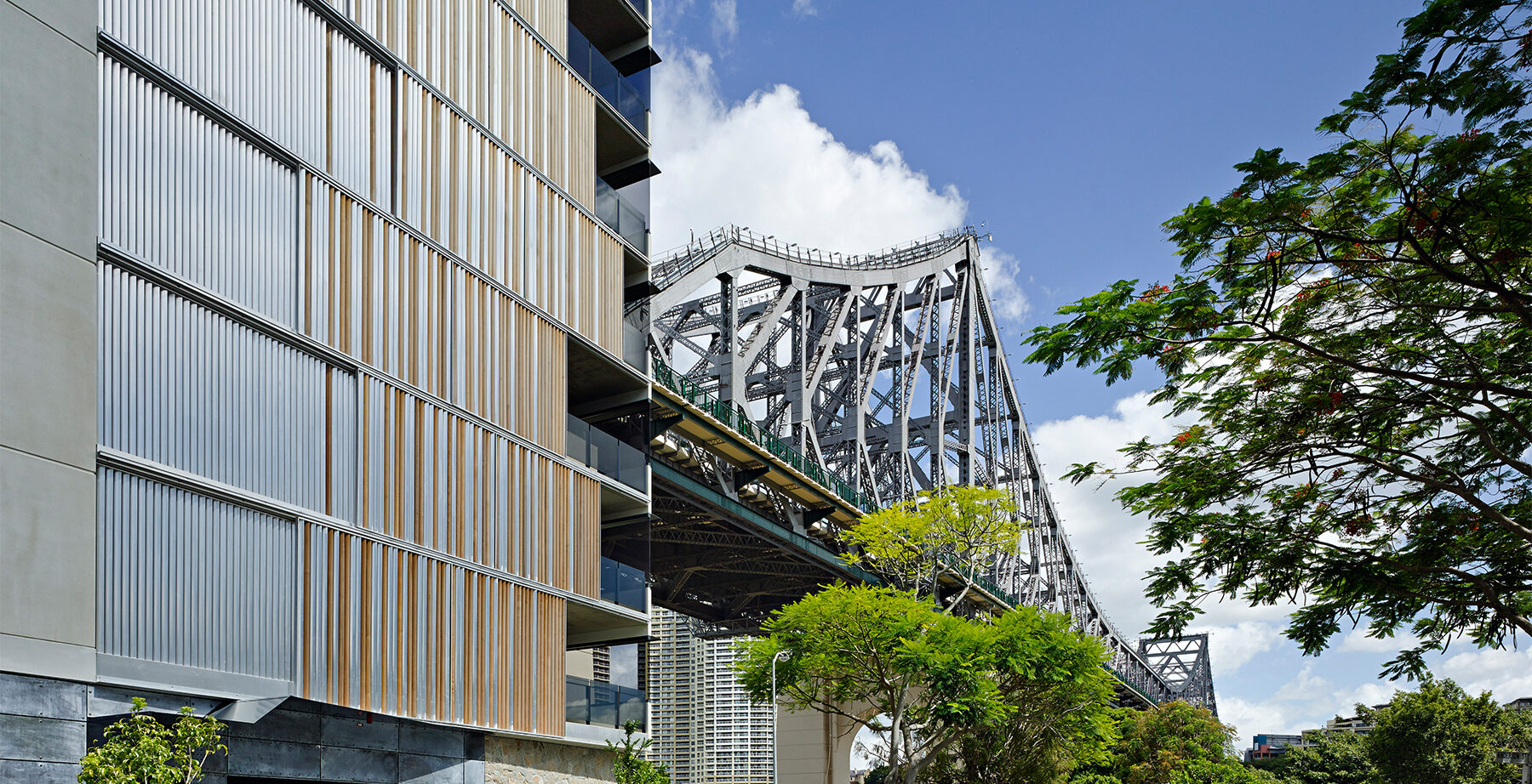 Positioned between the Story Bridge and Brisbane River, SILT mediates its intensely urban surrounds using materials like concrete, stone, steel, glass and aluminum. Issues of noise and privacy are managed with a façade treatment varying from dense and protected on the west to feathered and open on the east. The silted shores of the nearby river strongly influence the chromatic and textural expression of the building with concrete panels and ribbon glazing cast in long, sedimentary striations. Silt-coloured concrete walls extend this language into the interior realm where spaces are designed to move fluidly around a central, timber-clad core. Deep verandahs strengthen visual connections to the landscape and the long stretch of the Brisbane River towards New Farm. Movable screens offer climatic control while contributing to the whole and providing a sense of intrigue and sculptural ambiguity.